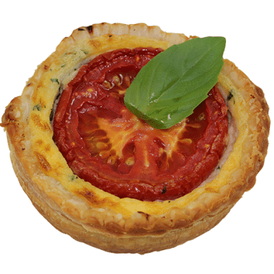 Eine köstliche Quiche mit einem Boden aus Blätterteig, gefüllt mit unserem hausgemachten Guss, einer frischen Tomate, cremigem Ricotta und einem Basilikumblatt.